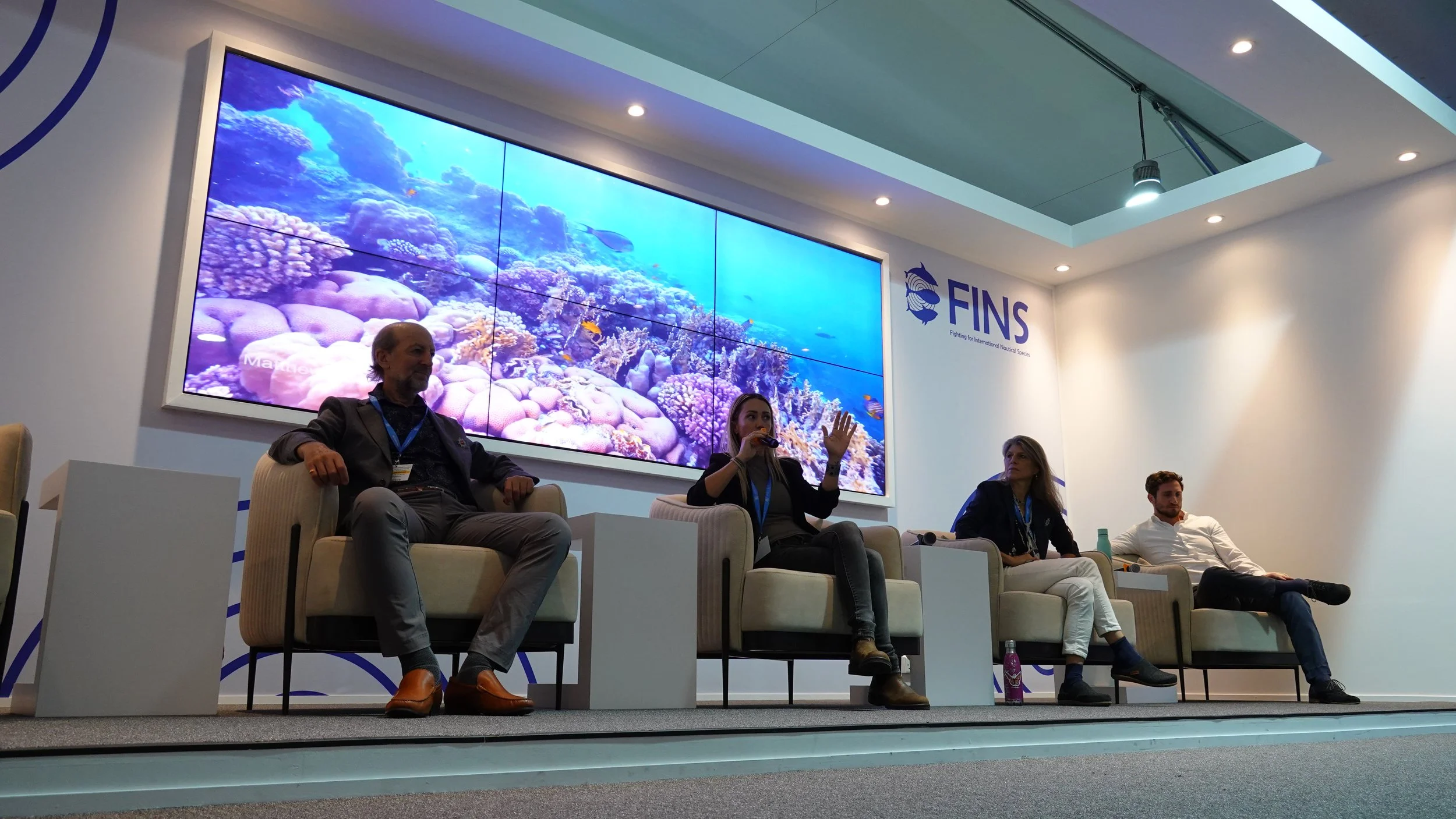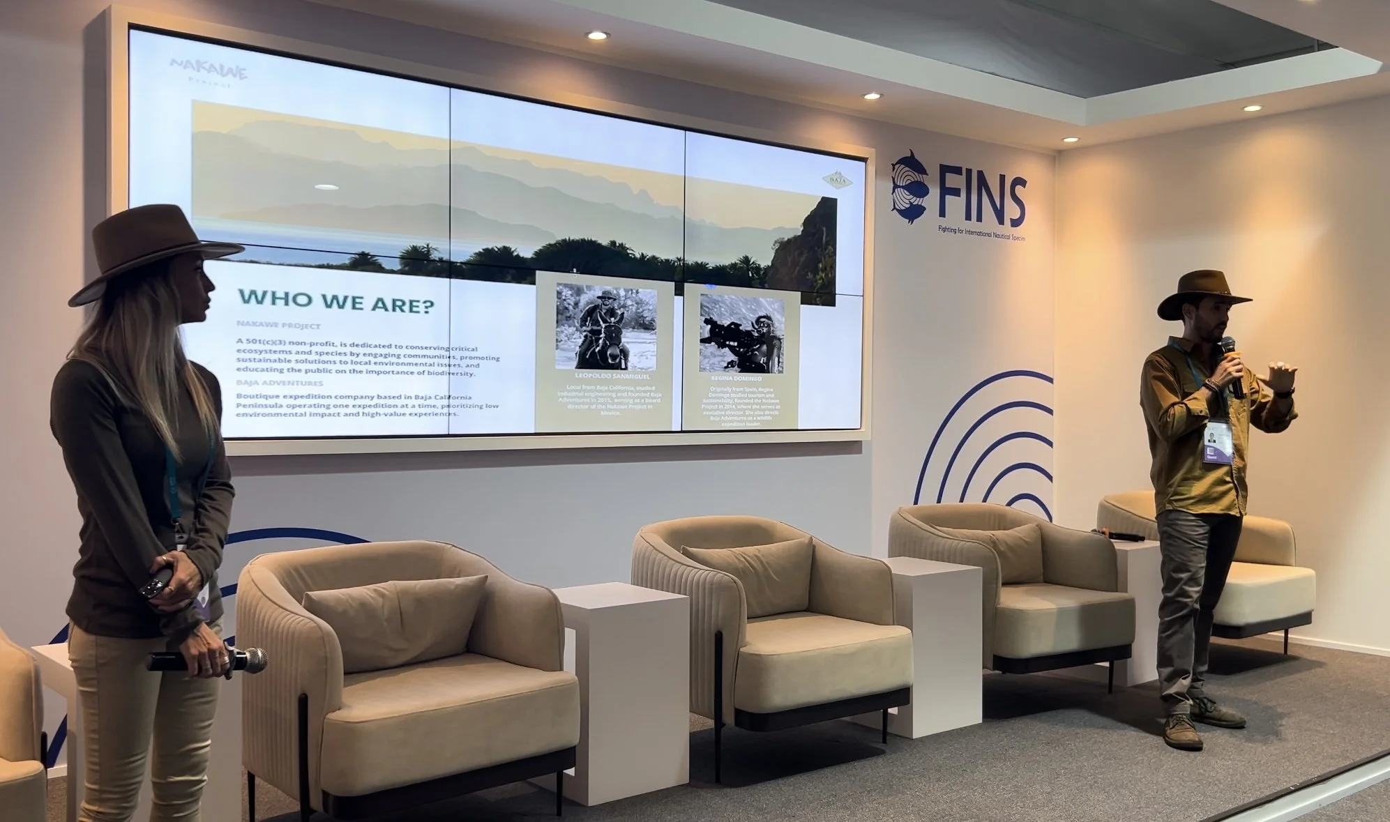 FINS initiative pavilion side event with Michael Fishback and Heather Watrous form Great Whale Conservancy, Regina Domingo from Nakawe Project, and Matthew David Kaplan Marine Wildlife Cinematographer.