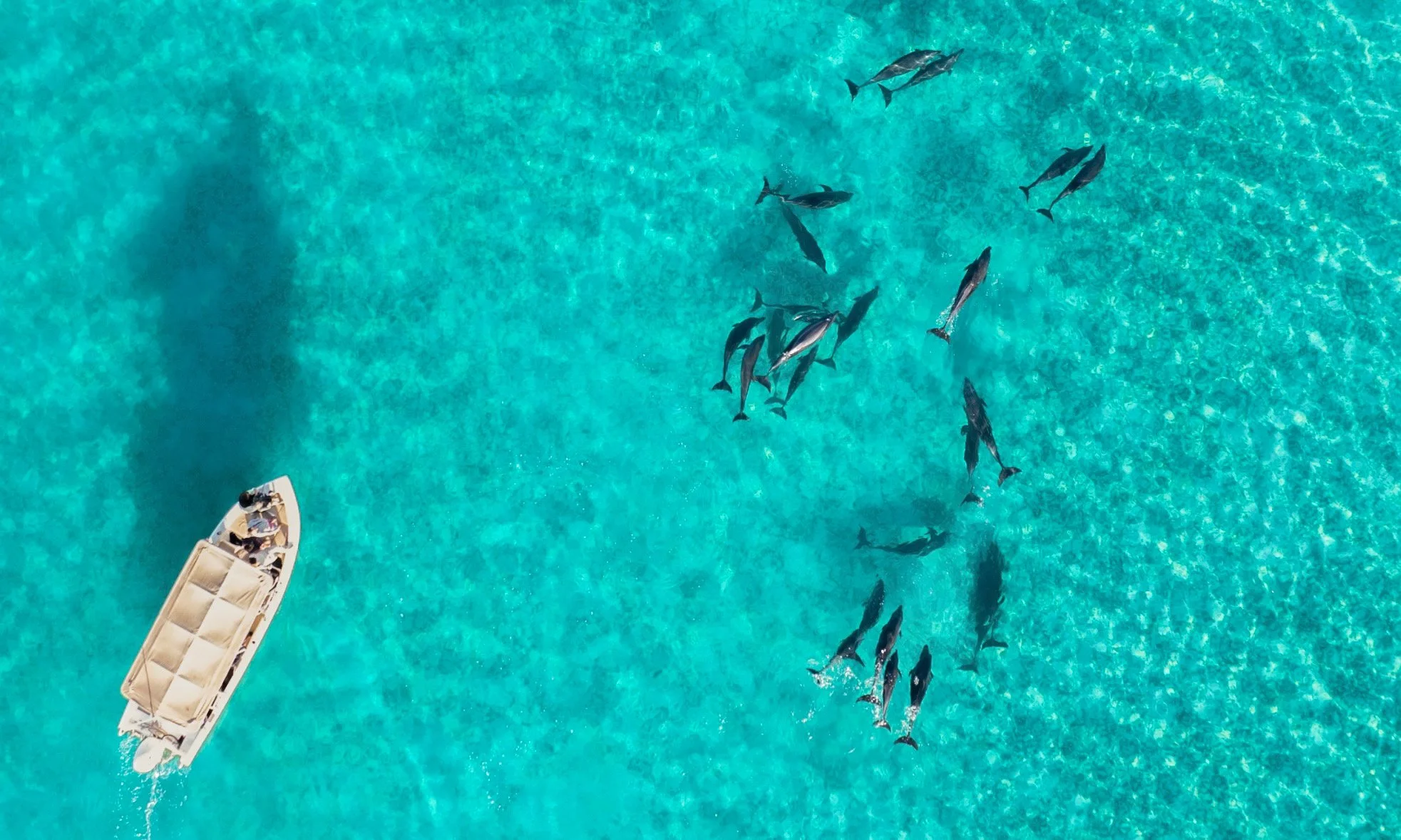 Baja Adventures boat in Loreto on a marine adventure surrounded by dolphins